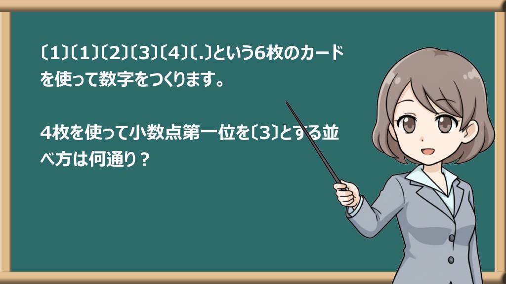 〔1〕〔1〕〔2〕〔3〕〔4〕〔.〕という6枚のカードを使って数字をつくります。4枚を使って小数点第一位を〔3〕とする並べ方は何通り?